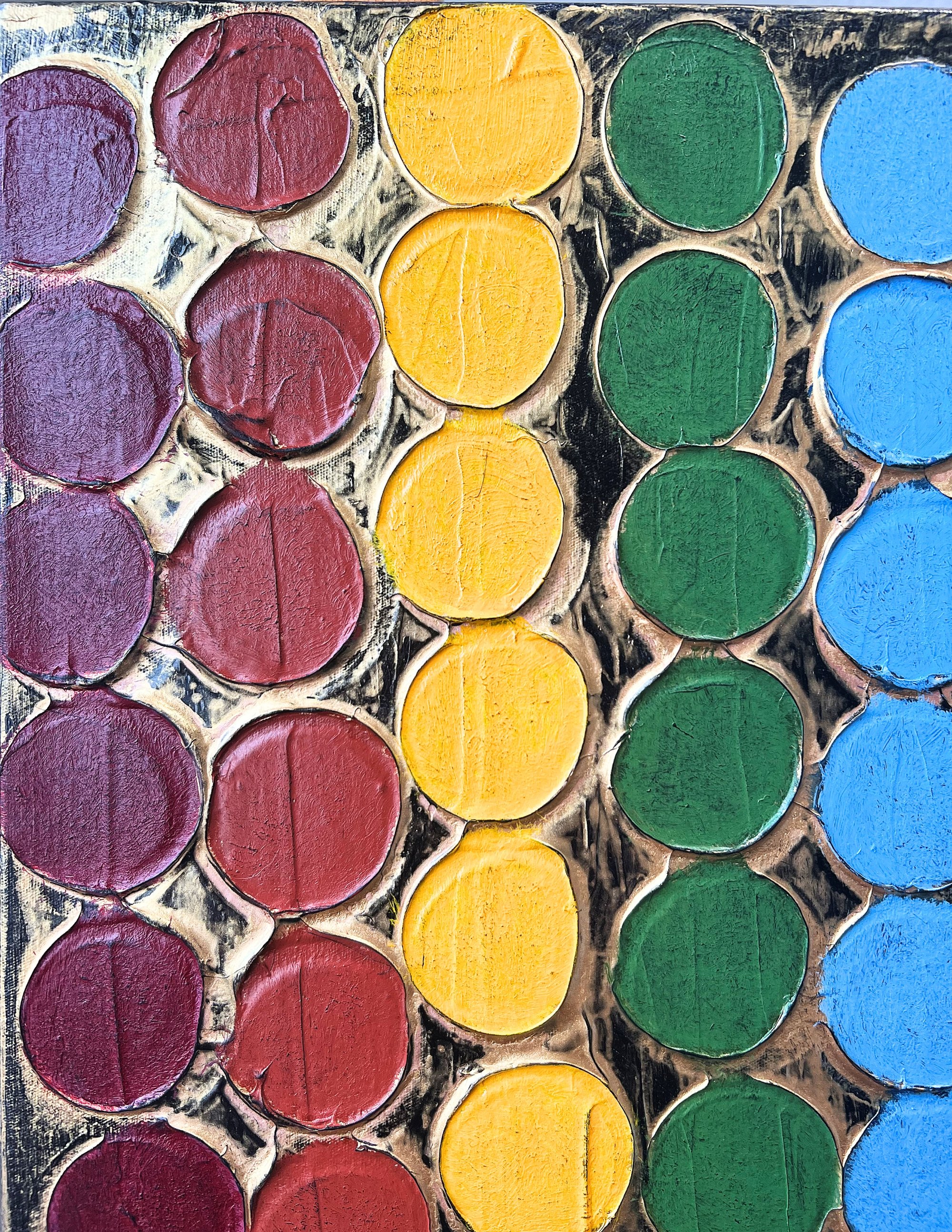 Chakras forma parte de la serie Amuletos, un proyecto que explora la energía de las piedras y cristales a través de la pintura. En esta obra, las hileras de círculos evocan cuentas ensartadas como en un collar, recordando el pasado de la artista en la joyería.