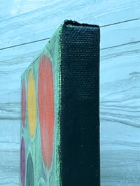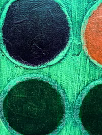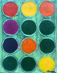 Obra abstracta que retrata a un ramo de gerberas en diferentes colores por medio de círculos o bolas. La artista toma imagenes de flores como inspiración y las traduce a retículas de círculos.