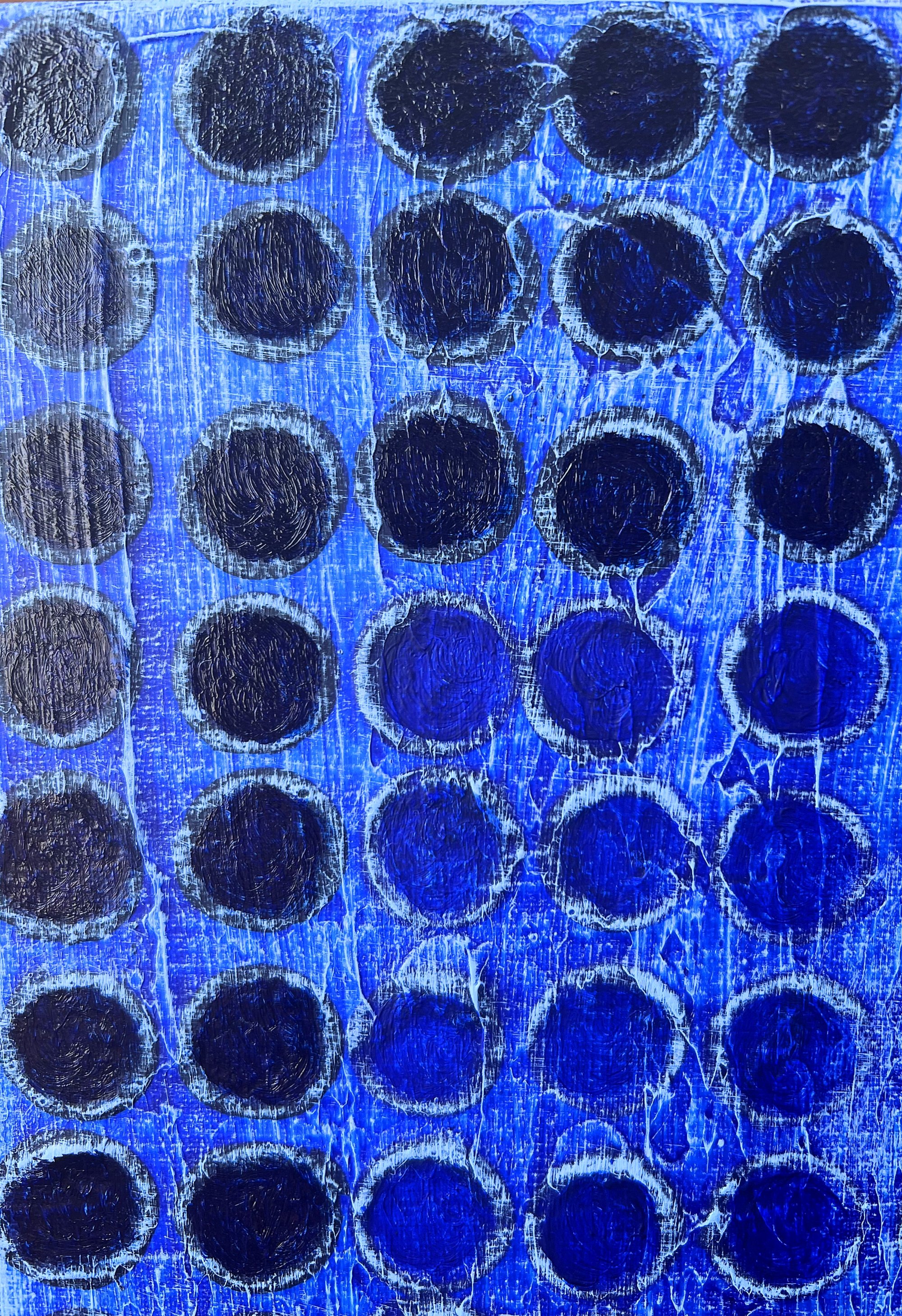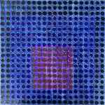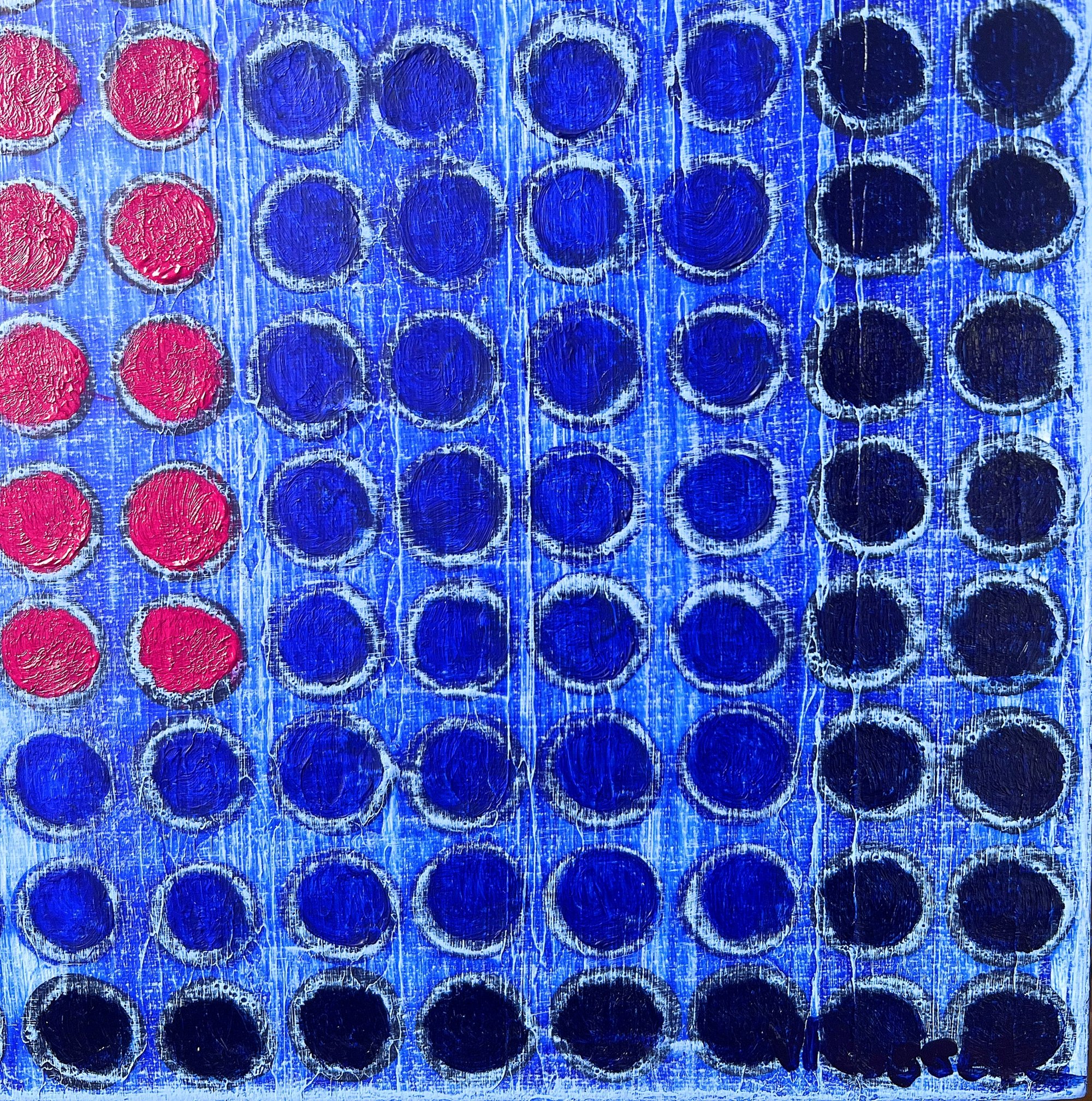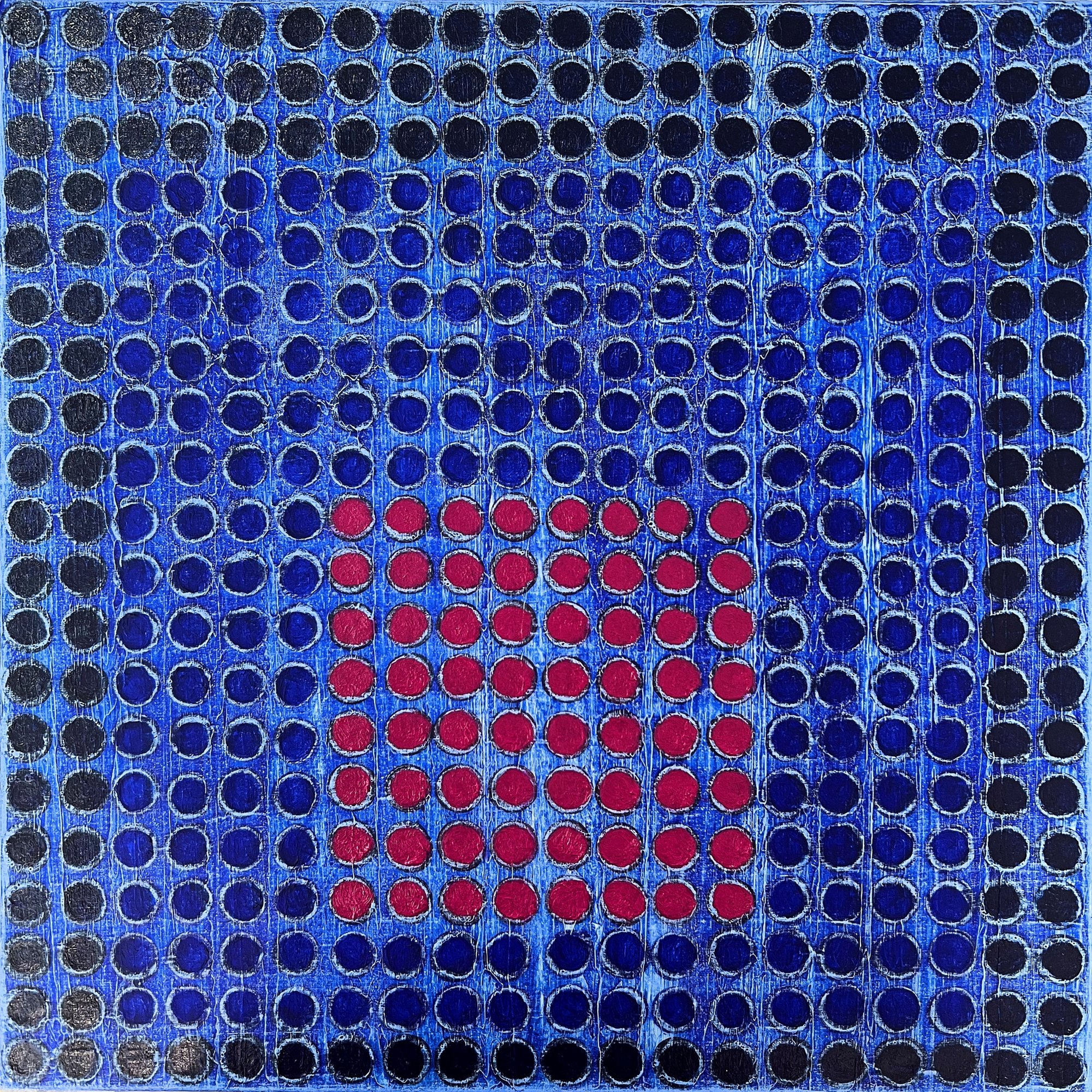En Retícula Radial 1, el color se organiza en una cuadrícula de puntos que vibra entre el orden y la pulsación rítmica. Los tonos azules profundos construyen un campo envolvente, donde la geometría se convierte en un espacio meditativo. En el centro, un grupo de círculos rojos irrumpe con fuerza, creando un contraste que concentra la mirada y transforma la composición en un núcleo energético.