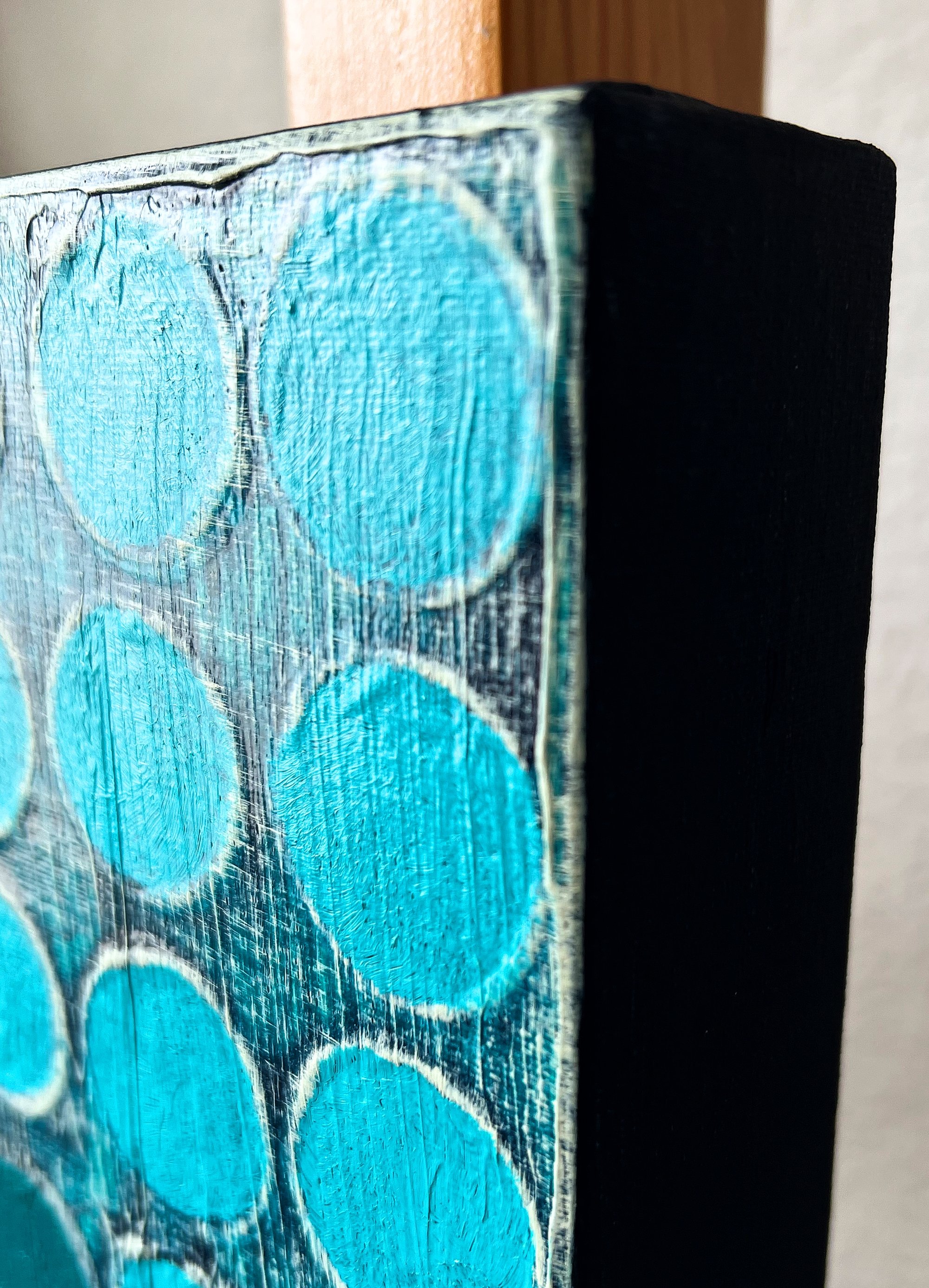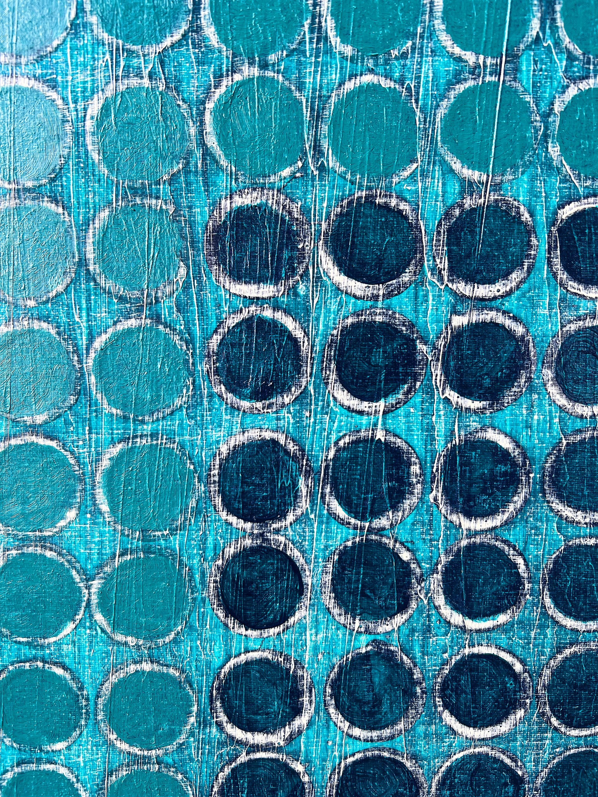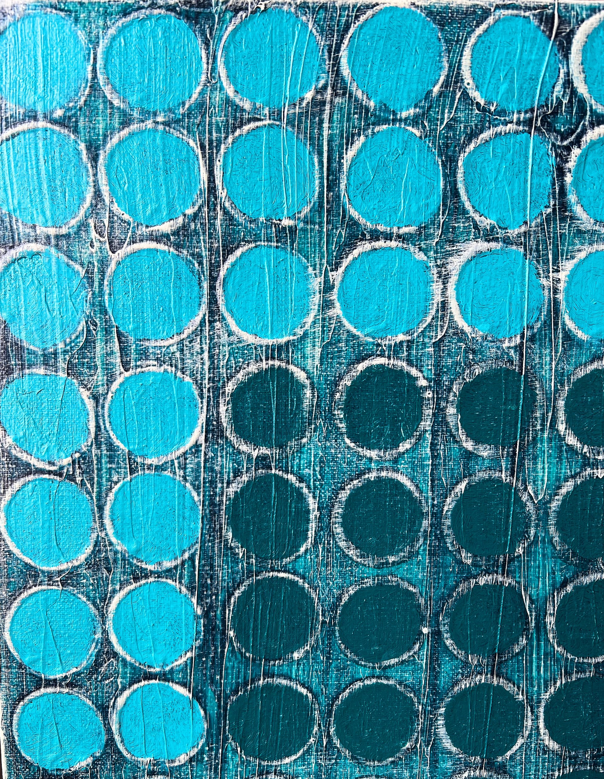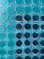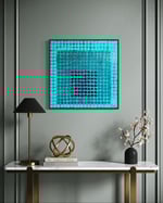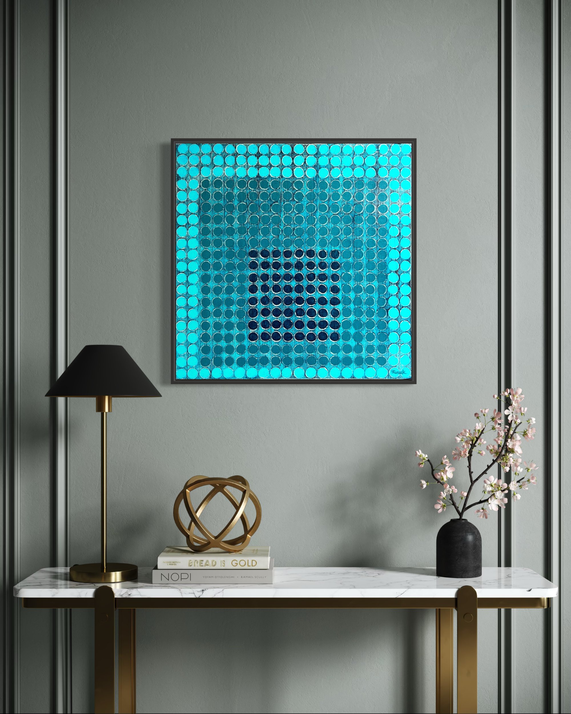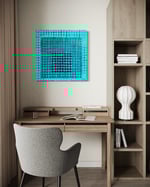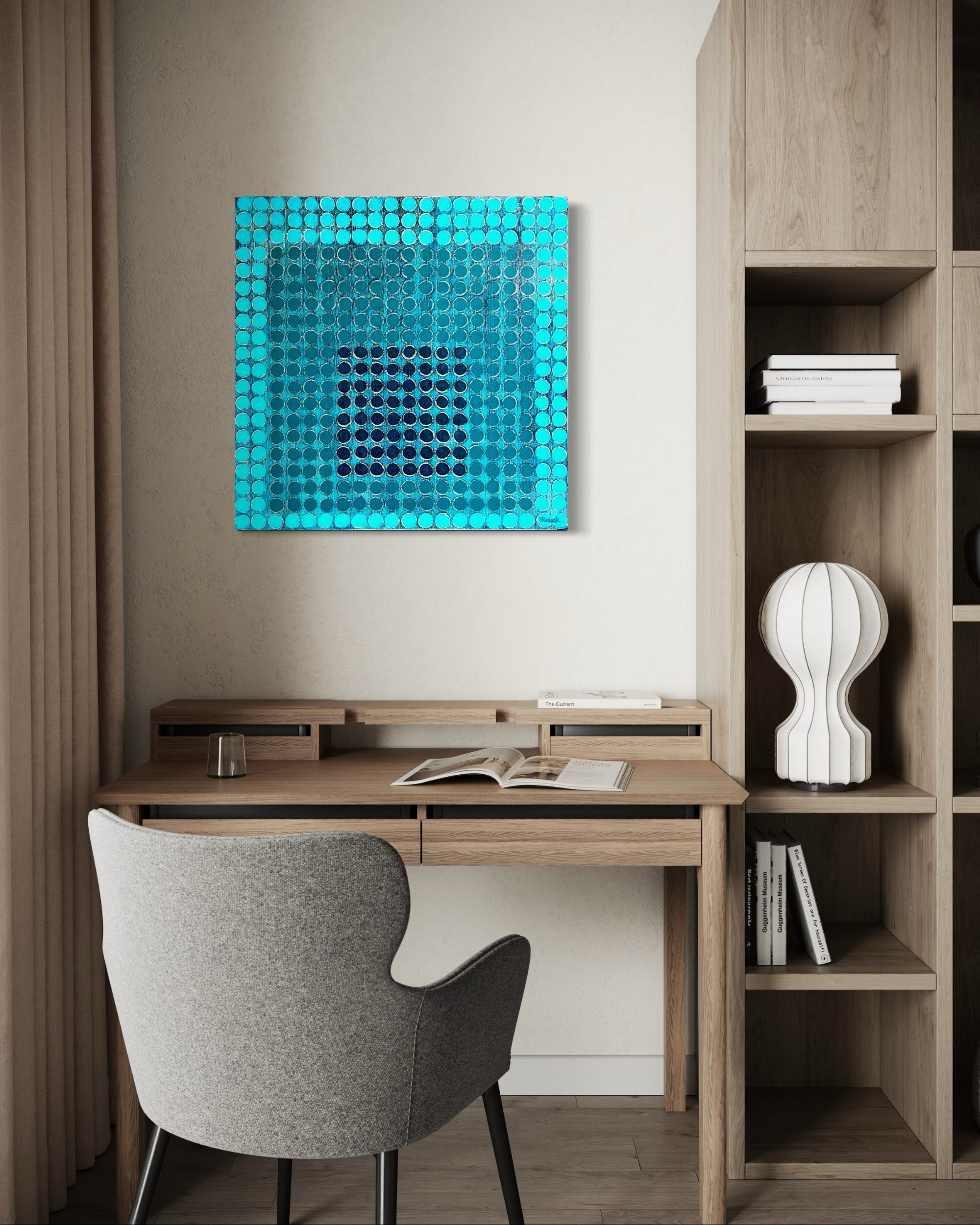 El azul turquesa y sus matices se convierten aquí en protagonistas, evocando calma, introspección y claridad. La geometría repetitiva invita al espectador a sumergirse en un espacio meditativo donde el color es el verdadero centro.
