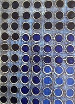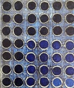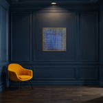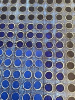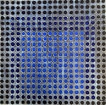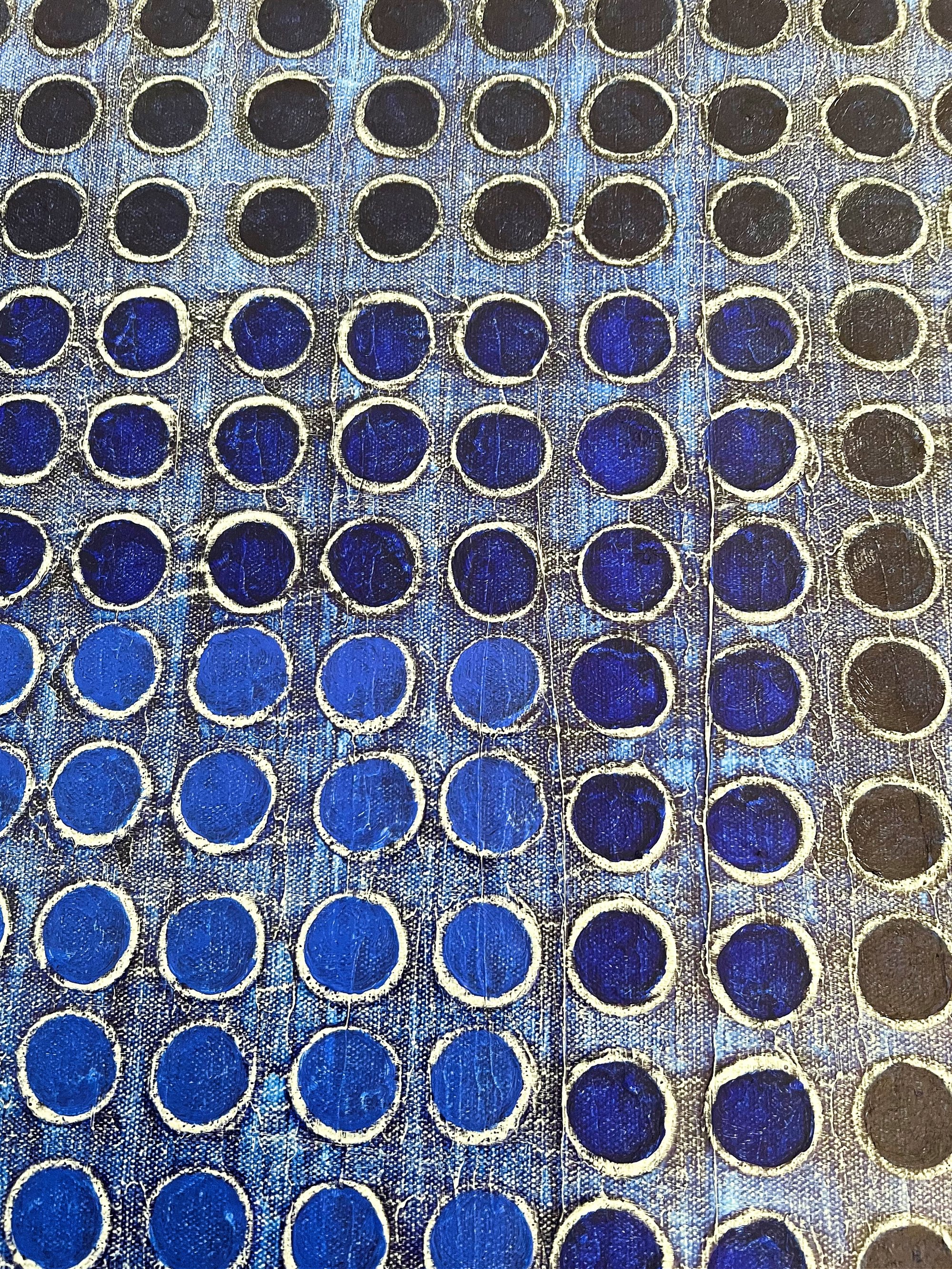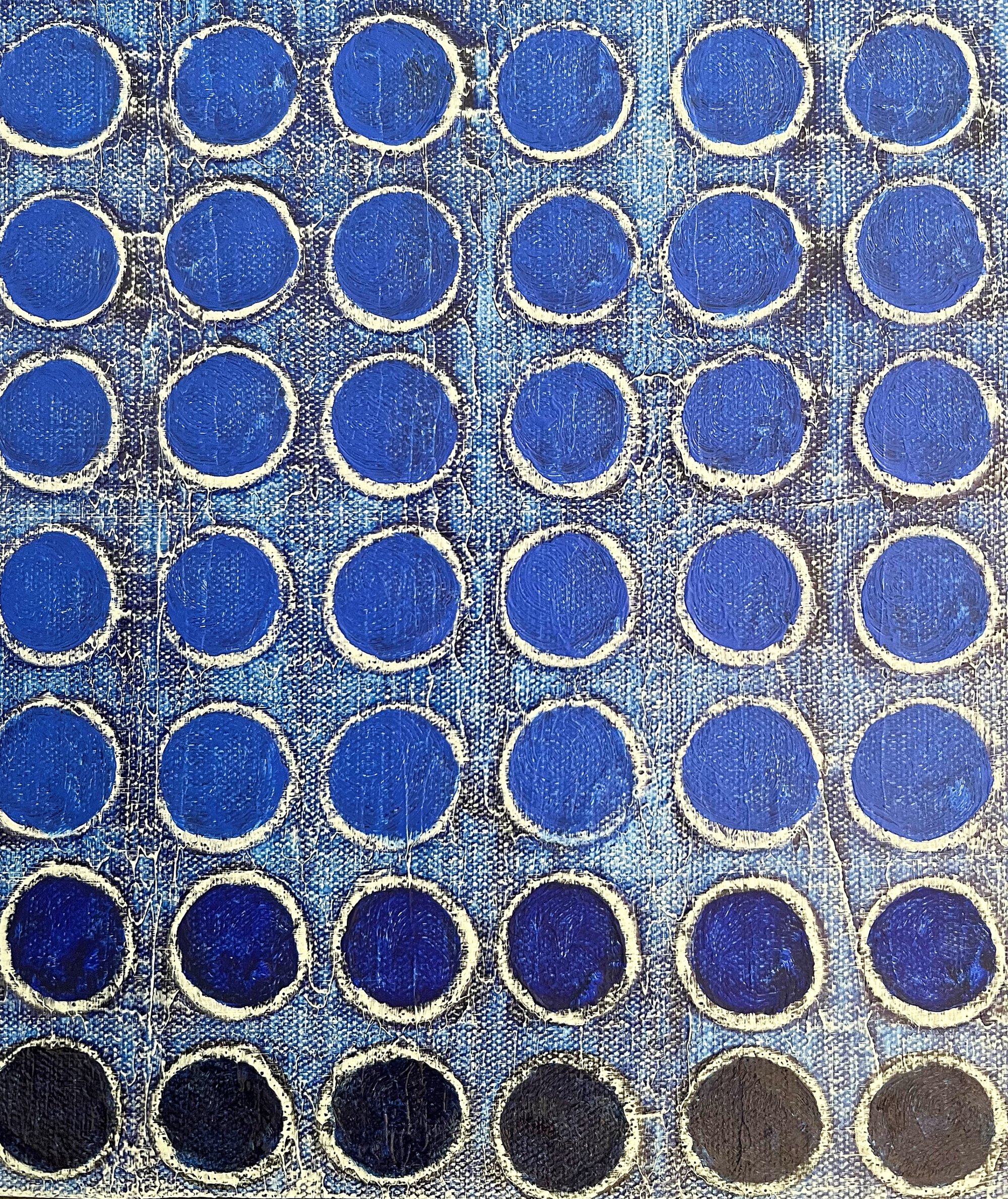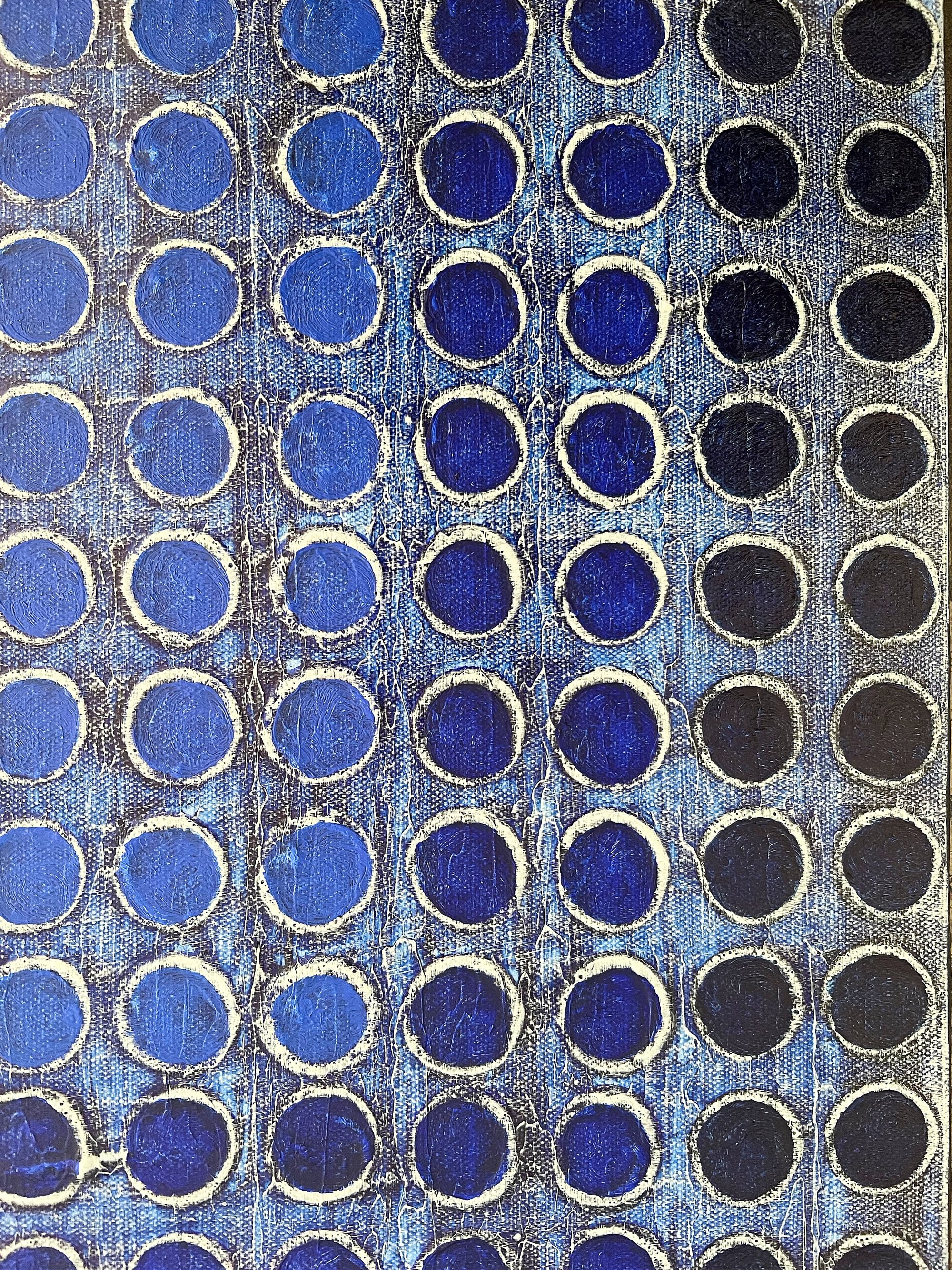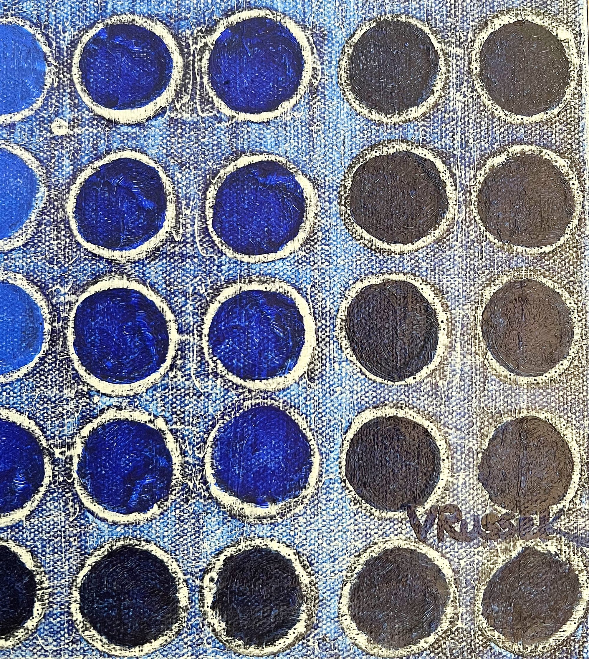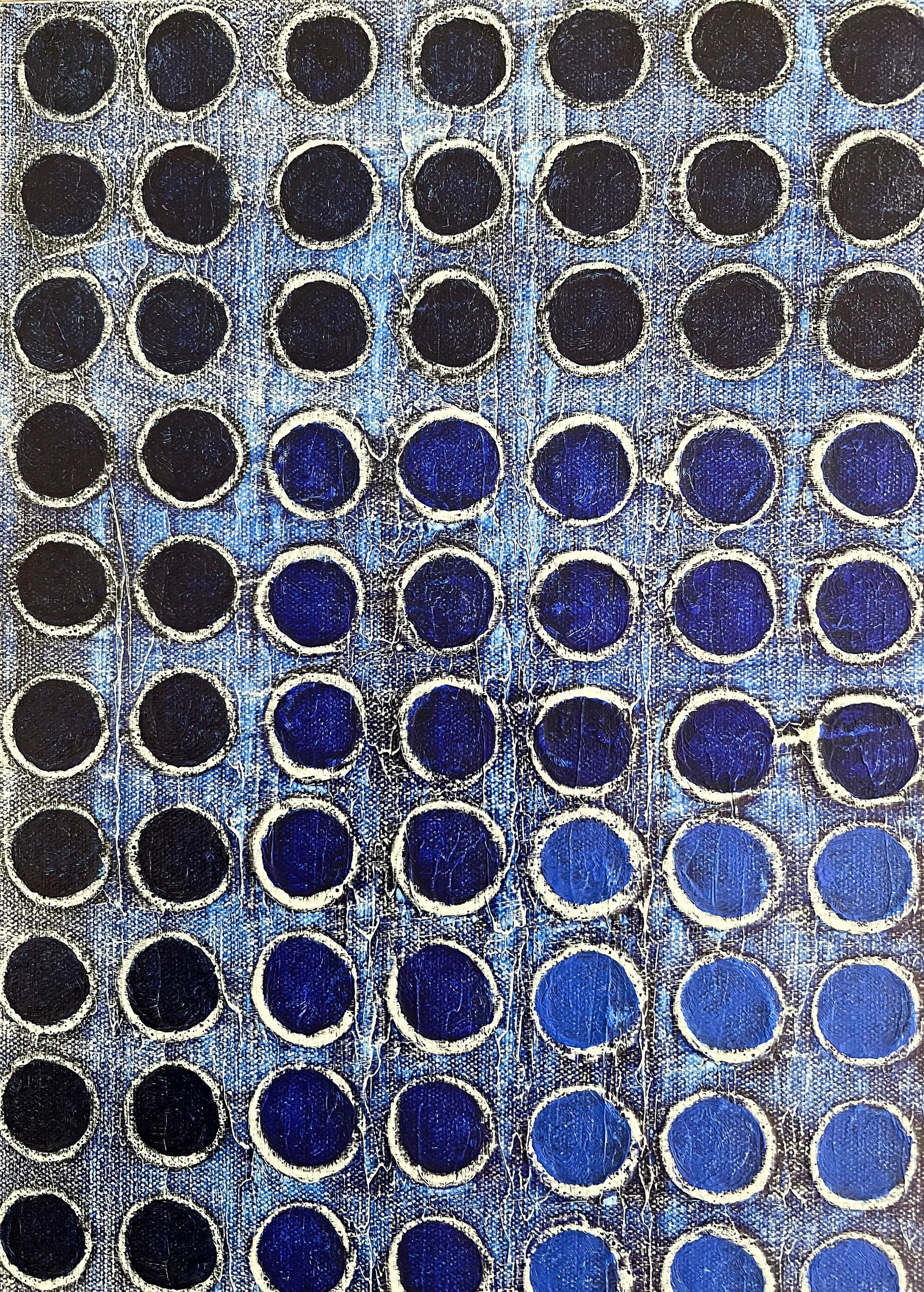 En Retícula Radial 12, Verónica Russek explora la profundidad emocional del azul en sus distintas manifestaciones. Desde la intensidad del anthraquinone hasta la luminosidad del cobalto, los matices se entrelazan en una composición que vibra con energía contenida.
