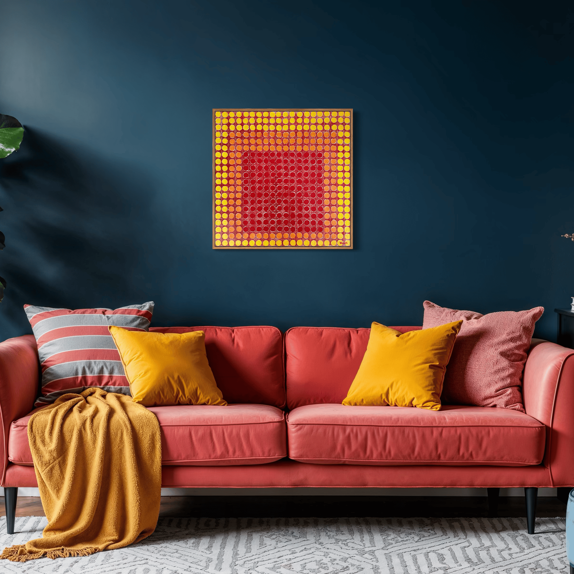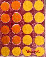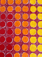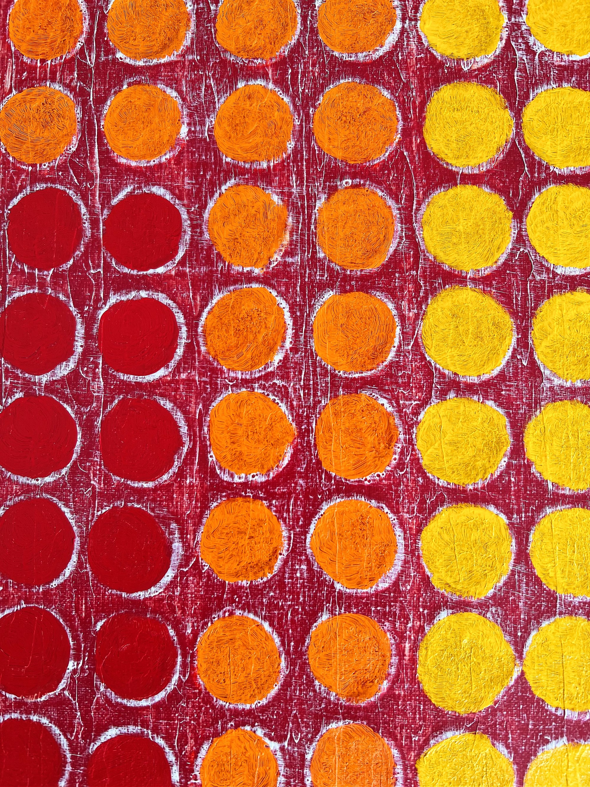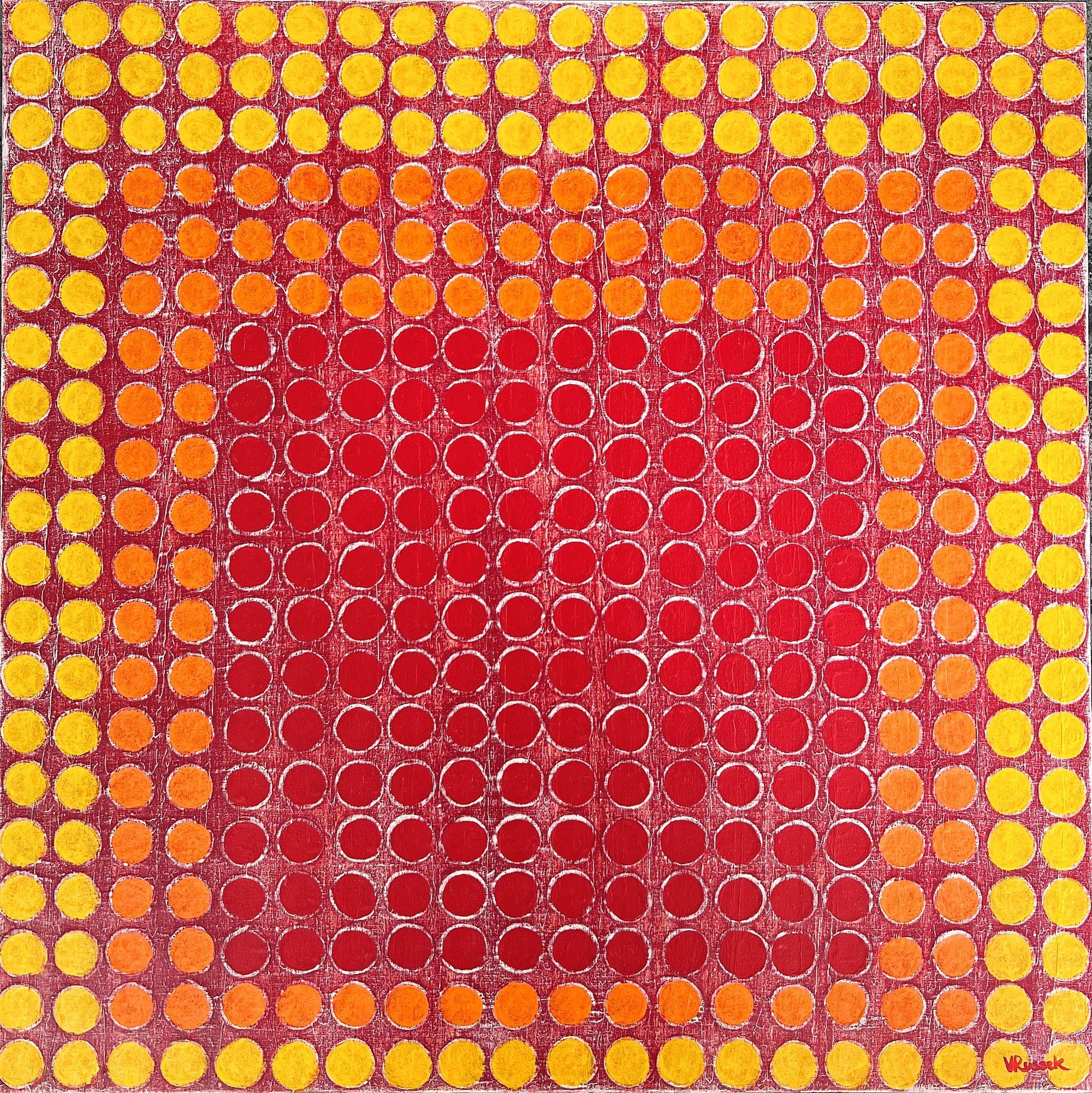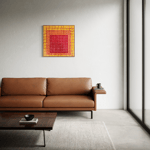 En Retícula Radial 14, el color se convierte en pulsación. Los tonos rojos, naranjas y amarillos irradian calor y movimiento desde el centro, evocando la energía del sol y la vitalidad interior.