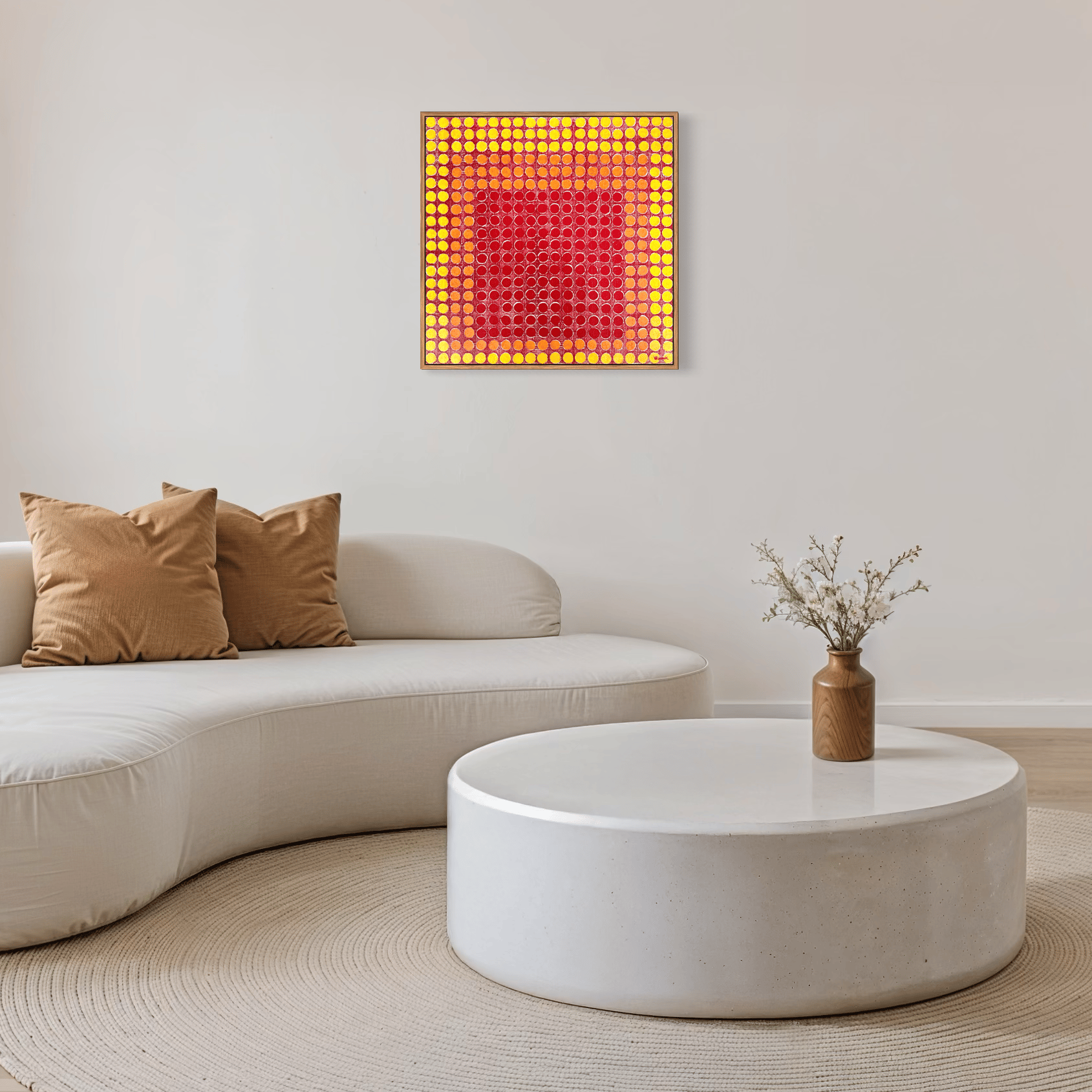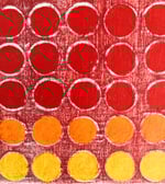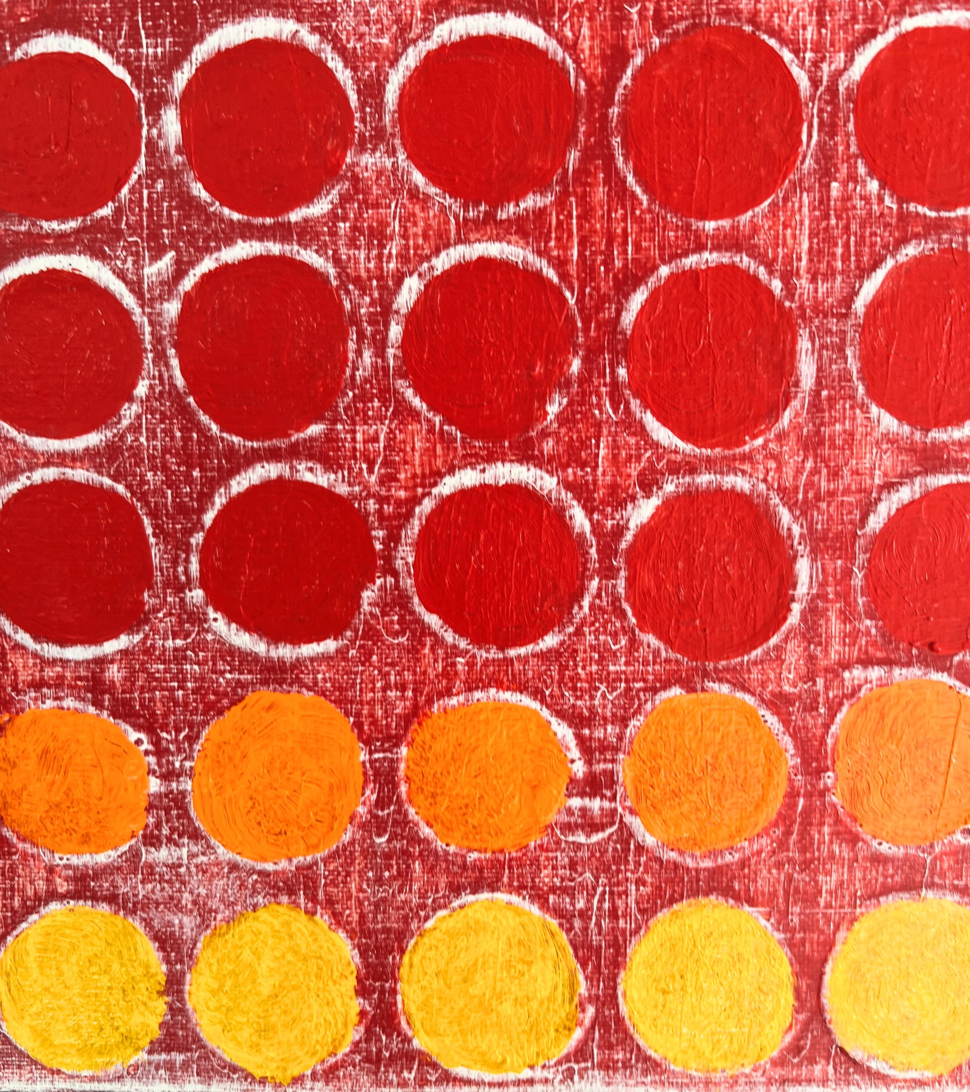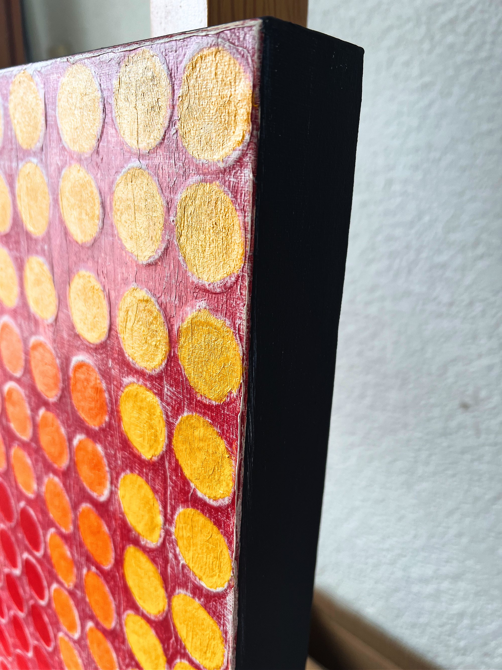 En Retícula Radial 14, el color se convierte en pulsación. Los tonos rojos, naranjas y amarillos irradian calor y movimiento desde el centro, evocando la energía del sol y la vitalidad interior.