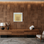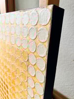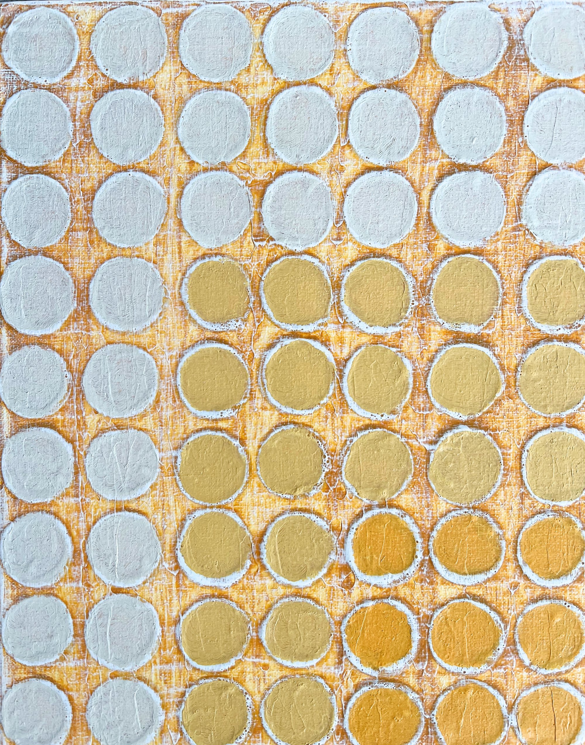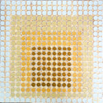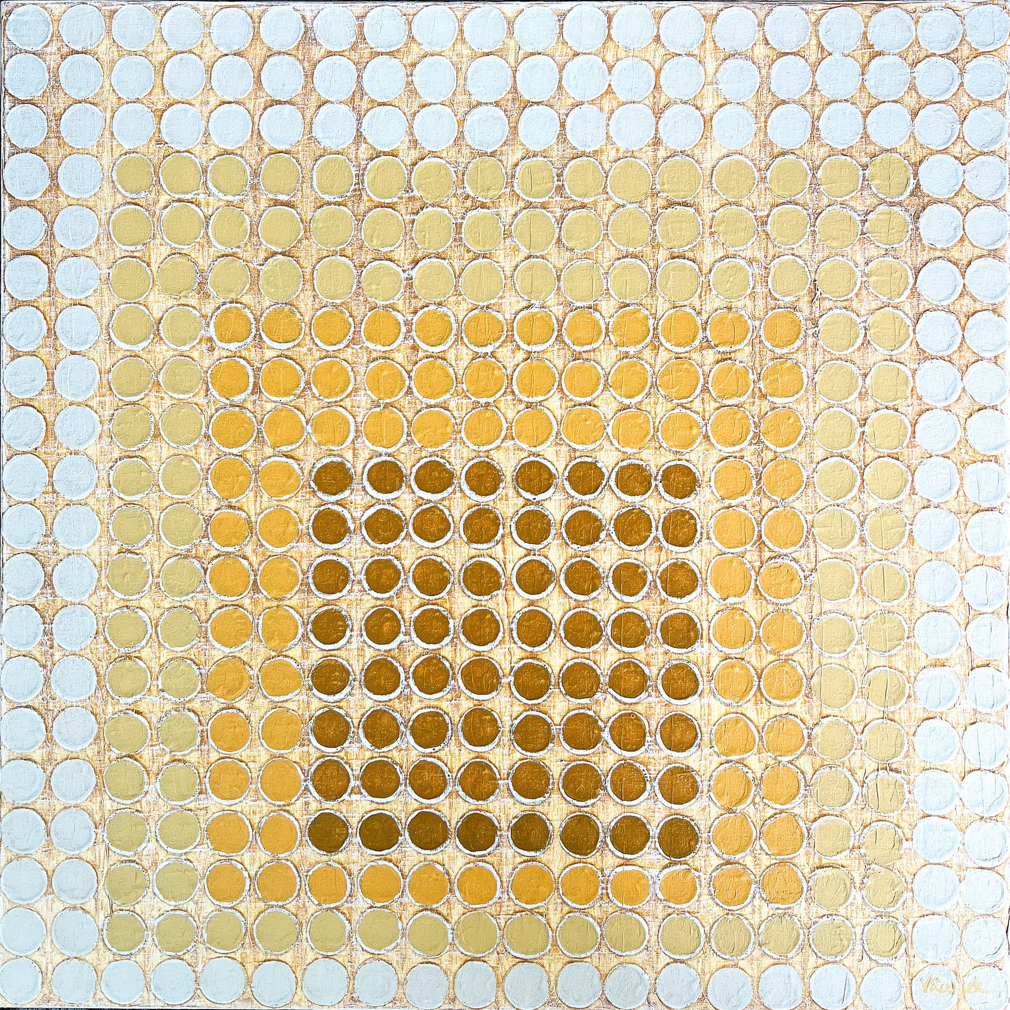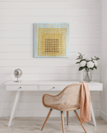 Esta obra pertenece a la serie El color como centro, donde el patrón circular se convierte en un lenguaje de vibración y energía. En Retícula Radial 15, los ocres amarillos y el tono titan buff generan una sensación de calidez y expansión, evocando la luz del sol y la vitalidad del color. Las variaciones tonales y la textura sutil crean una profundidad que invita a contemplar el equilibrio entre estructura y emoción.