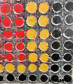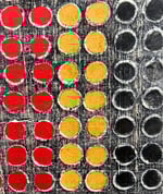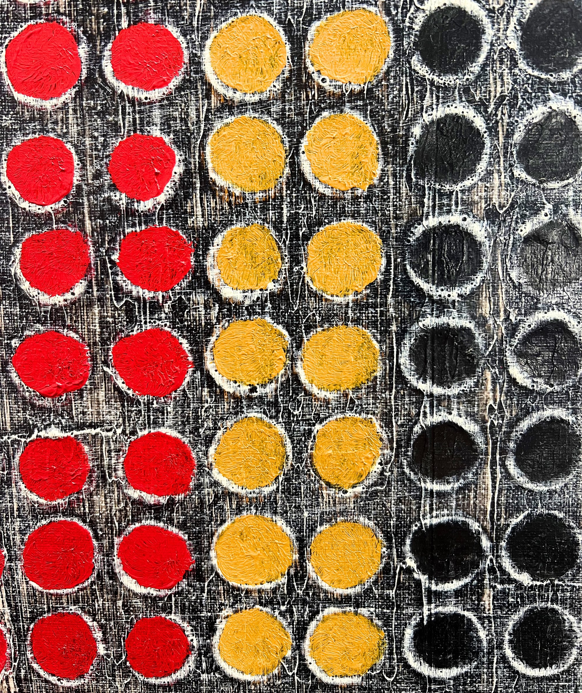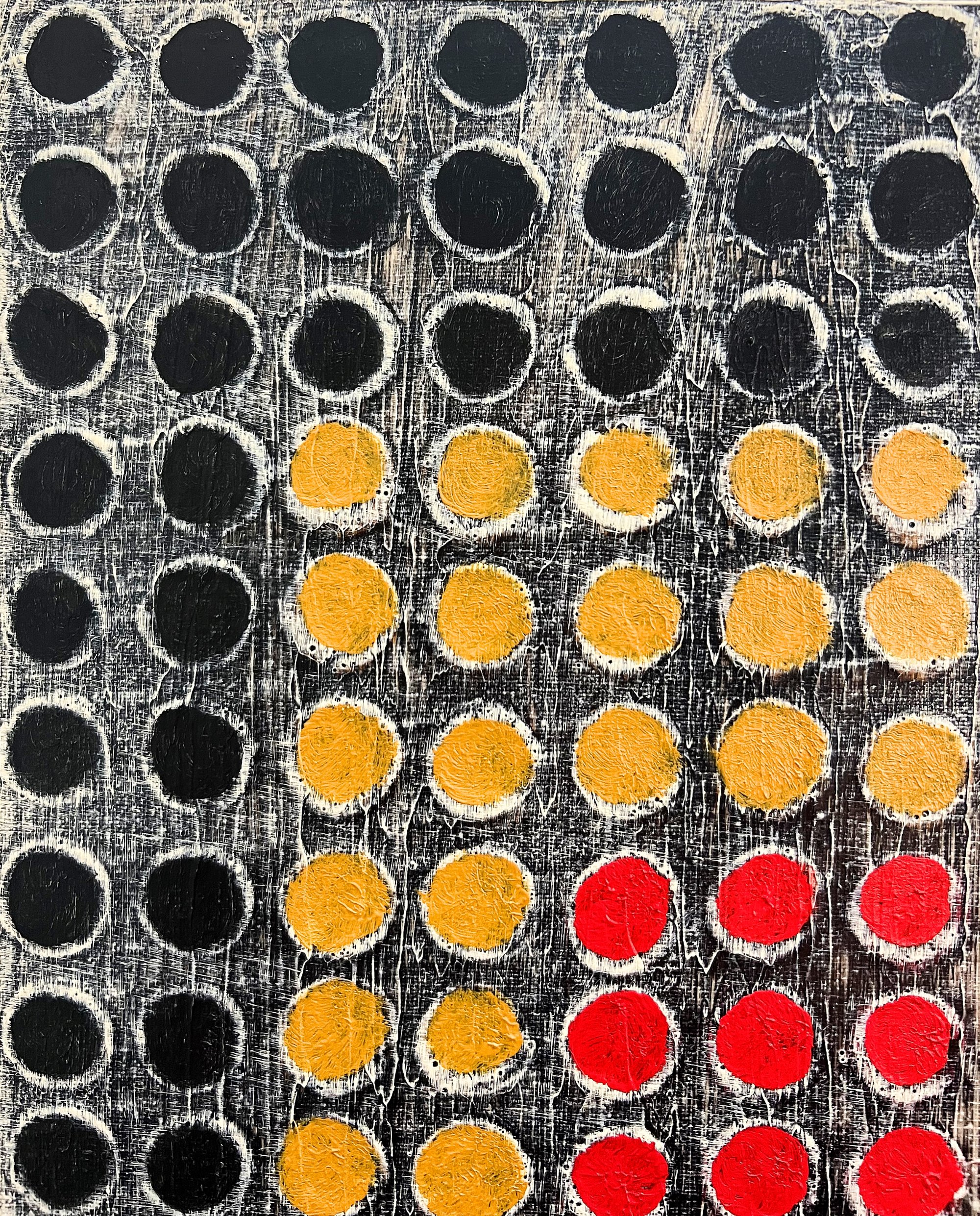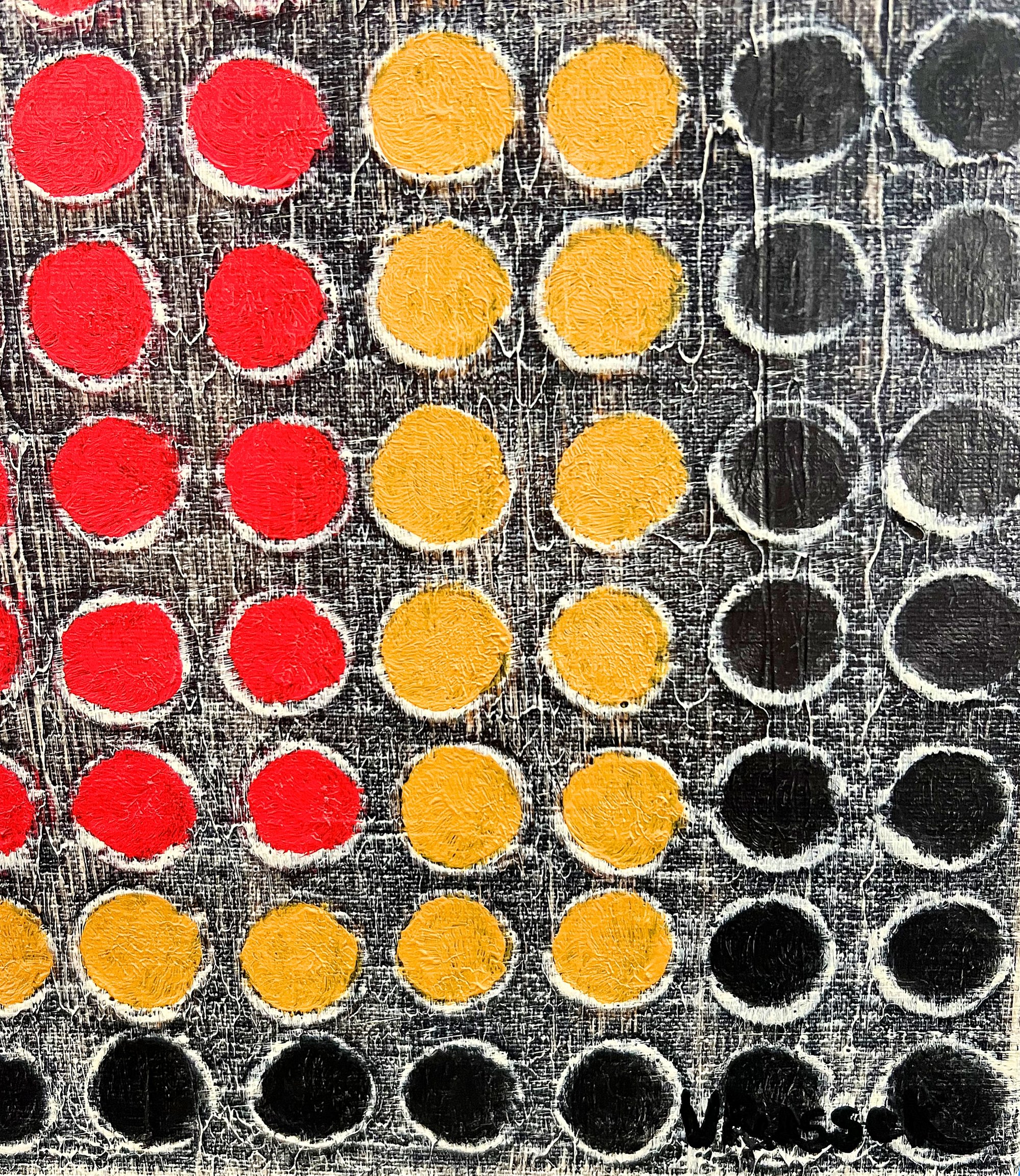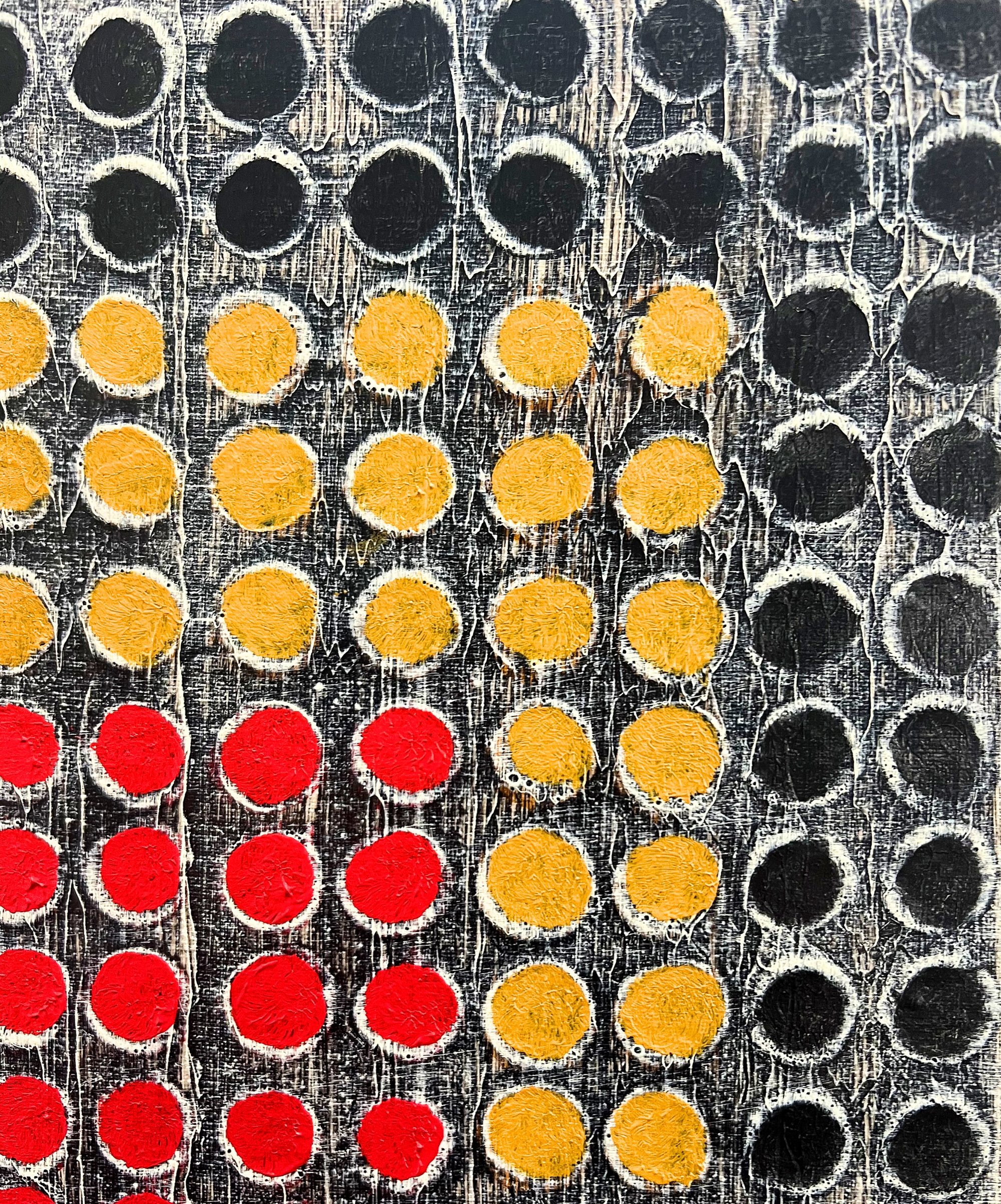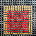En Retícula Radial 3, la composición se organiza en una retícula donde el color late desde el centro hacia afuera. Los puntos rojos dominan el núcleo, generando una vibración intensa que se potencia con la transición hacia los tonos amarillos y, finalmente, hacia el negro que delimita el perímetro. Esta gradación cromática convierte la superficie en un espacio dinámico que evoca expansión y energía radiante.