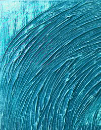 Obra abstracta en un flujo vertiginoso en espiral, en azul turquesa, que tiene propiedades del azul como verdad, principio, voluntad y fé, y del verde como vida, abundancia y armonía.